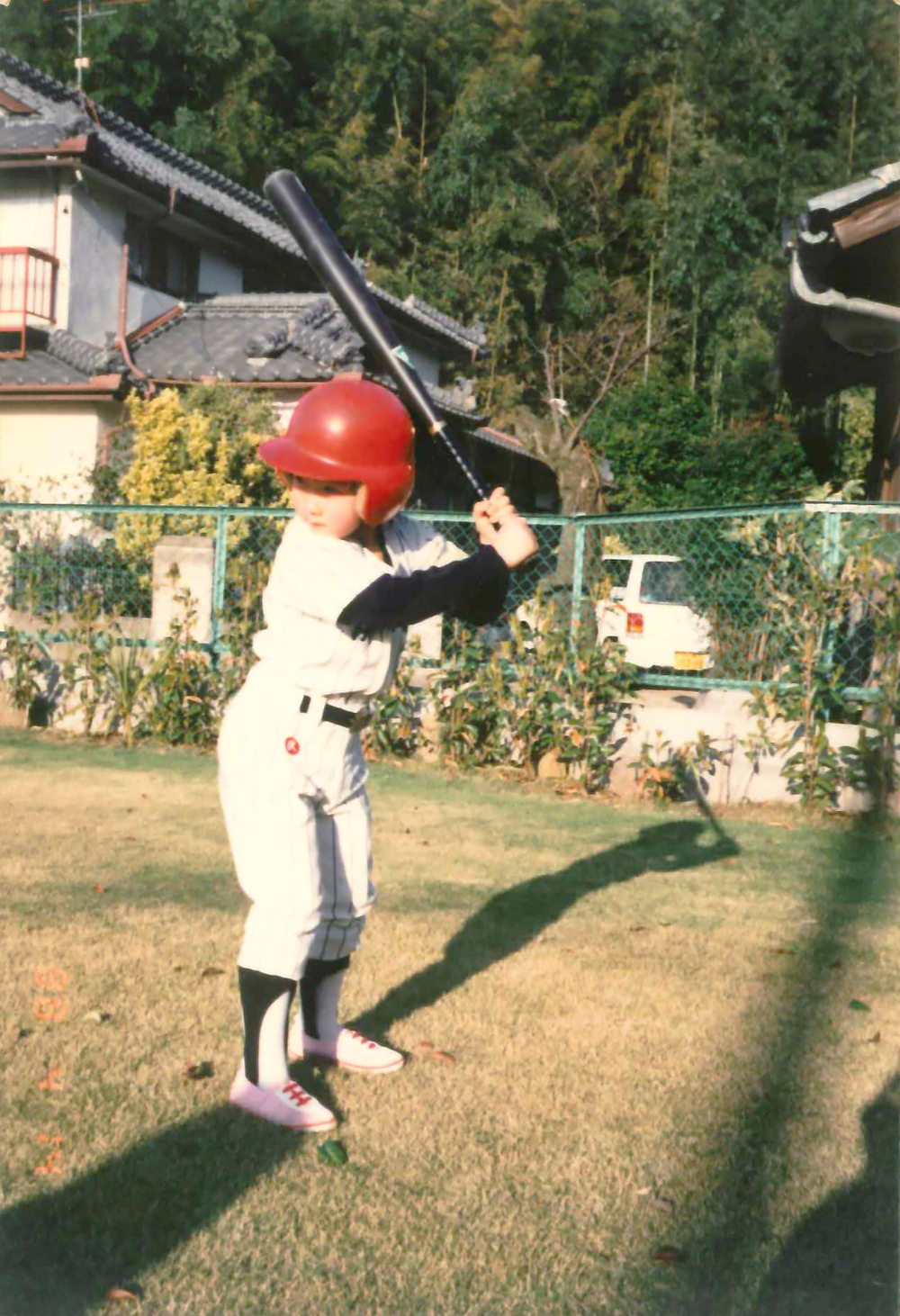 まだ3、4歳なのでプラスチックの軽いバットを持たせ、スイングがレベルになる様、毎日晩酌しながら長い竹の棒を持ち、悪いスイングをするとピシャッと軽く叩き、痛みを身体で覚えさせ、スイング矯正をしていました。